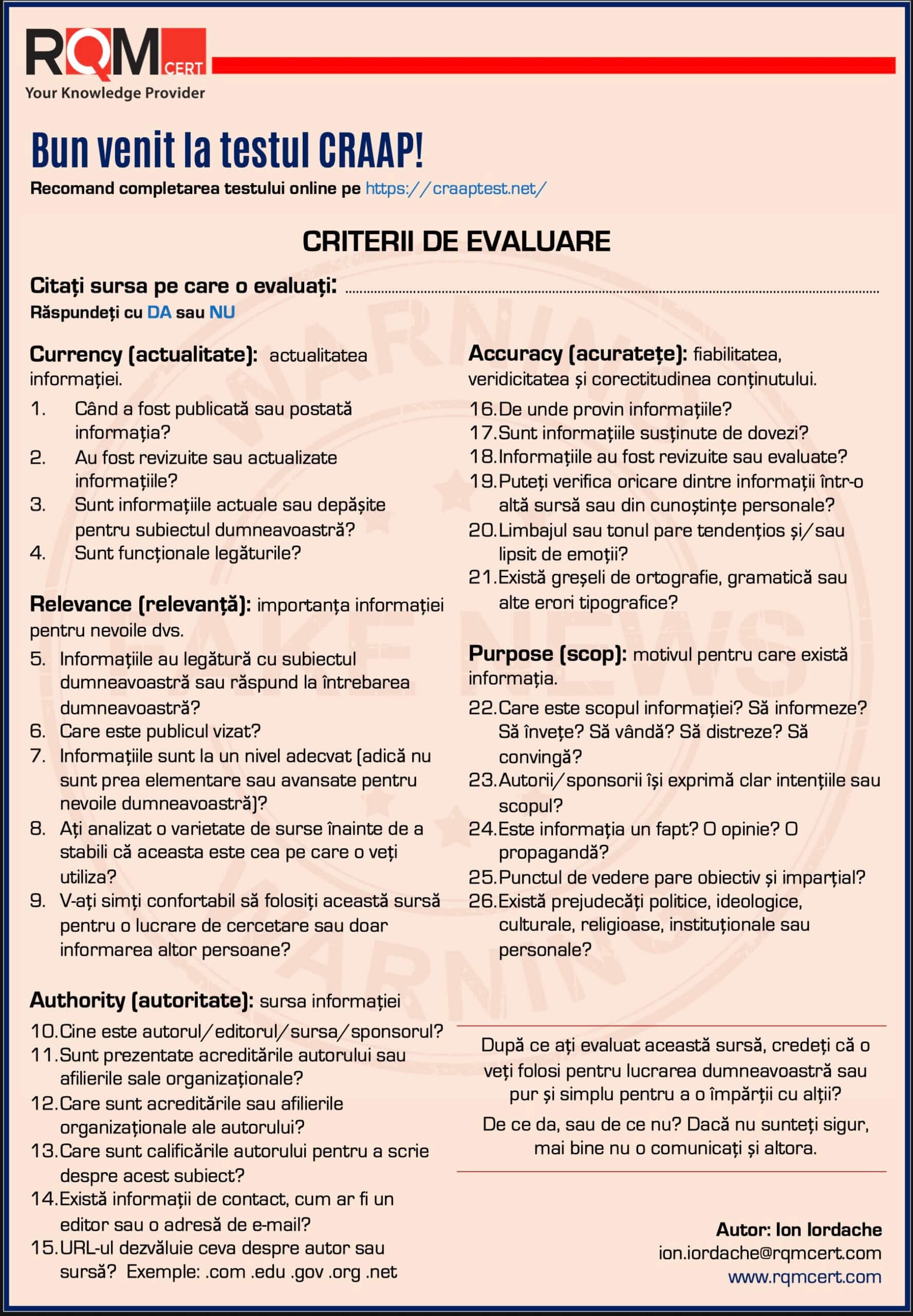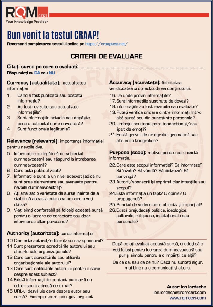 Lipsa verificării este un alt dezavantaj major: oricine poate posta orice fără o verificare prealabilă, iar acest lucru ne obligă să fim și mai atenți la ceea ce credem și distribuim.În mai multe din articolele mele și la toate cursurile pe care le susțin, eu promovez Testul CRAAP (Currency, Relevance, Authority, Accuracy, and Purpose) dezvoltat de Sarah Blakeslee împreună cu echipa sa de la Universitatea California, Chico care este un instrument utilizat pentru a evalua calitatea informațiilor pe care le găsim online. Acesta ne ajută să înțelegem dacă o sursă este fiabilă și dacă informațiile pe care le oferă sunt corecte și relevante pentru ceea ce căutăm. Gândițivă la testul CRAAP ca la un fel de “detector de fake news”. E ca și cum ai avea o lupă magică cu care să examinezi o știre și să vezi dacă e bună de luat în seamă sau dacă e doar o păcăleală.