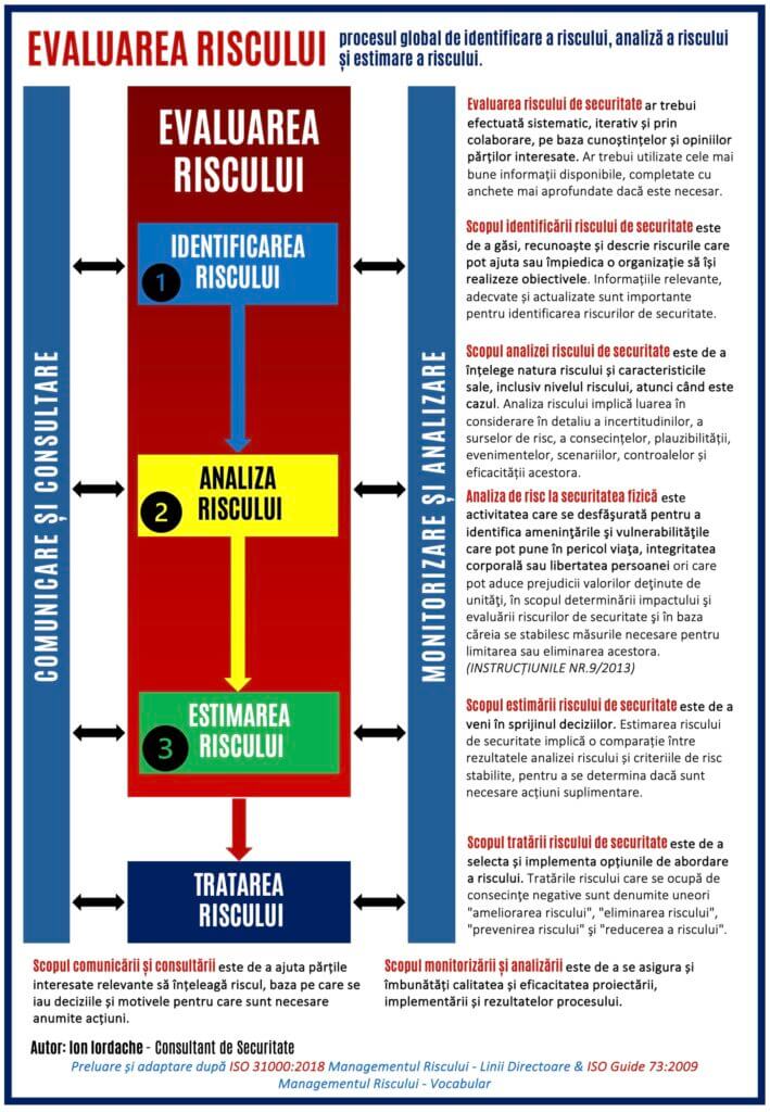 - procesul de evaluare implică identificarea factorilor de risc, estimarea impactului potențial și a probabilității de apariție, pentru a stabili măsuri adecvate de control și reducere a riscurilor.