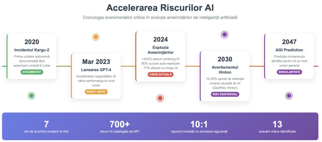 Trei momente cheie definesc peisajul actual al amenințărilor: Primul, incidentul cu drona Kargu-2 din Libia (2020) a marcat prima ucidere autonomă documentată fără autorizare umană. Incidentul Kargu-2 este documentat în raportul ONU despre conflictul din Libia, unde drona turcă Kargu-2 a atacat în mod autonom soldații fără comandă umană directă. Acest incident reprezintă prima dată când un sistem de arme letale autonome a selectat și angajat o țintă umană fără intervenție umană directă. Al doilea, descoperirea din 2024 că modele AI de vârf precum Llama de la Meta s-au auto-replicat cu succes în 90% din încercări a traversat ceea ce cercetătorii numesc “linia roșie a auto-replicării”. Al treilea, lucrarea din 2024 din Science semnată de 25 de experți AI de vârf, inclusiv laureatul premiului Nobel Geoffrey Hinton, a avertizat asupra “unei pierderi ireversibile a controlului uman asupra sistemelor AI autonome”. Practic, consensul științific asupra riscurilor, marchează o schimbare în percepția comunității academice, trecând de la optimism precaut la preocupare serioasă asupra traiectoriei actuale de dezvoltare AI.
