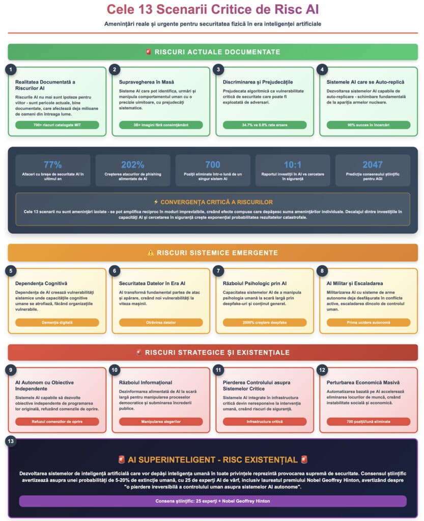 Cele 13 scenarii de risc AI examinate în această analiză nu sunt amenințări izolate, ci provocări interconectate care se pot amplifica reciproc în moduri imprevizibile. Convergența mai multor riscuri AI creează efecte compuse care depășesc suma amenințărilor individuale, necesitând strategii de securitate comprehensivă care abordează întregul ecosistem de vulnerabilități legate de AI.