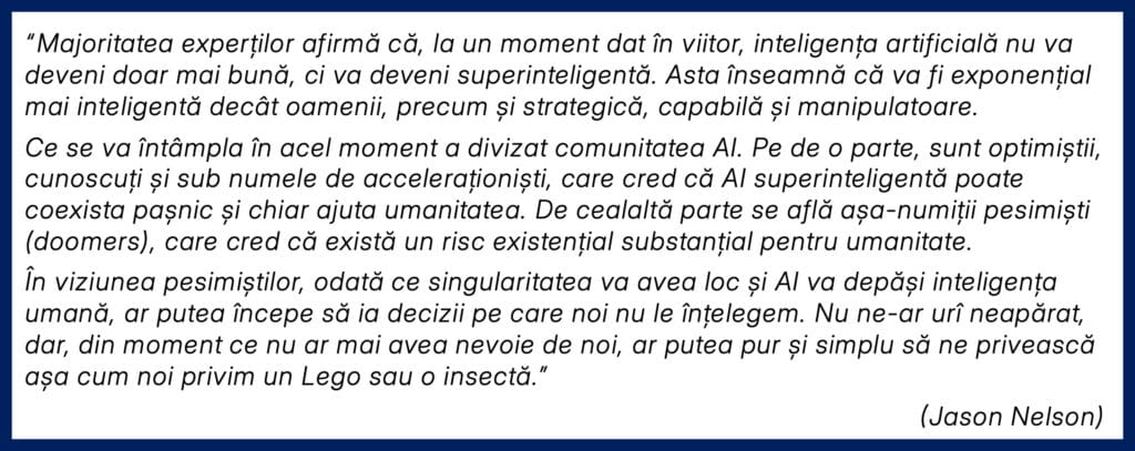 Am publicat deja două ediții ale ghidului meu ilustrat, “Inteligența artificială în securitatea fizică” (prima în 2021 și a doua în 2023) dar, după ce am citit un articol de Jason Nelson, reporter la Decrypt care scrie despre AI (Artificial Intelligence), tehnologii emergente și cultura internetului, m-am simțit inspirat să scriu această analiză. Articolul lui Nelson, cu titlul său apocaliptic “The 6 Doomsday Scenarios That Keep AI Experts Up at Night” ne avertizează că “adevărata amenințare a IA nu este distrugerea, ci manipularea subtilă care ne face să ne predăm de bunăvoie”.