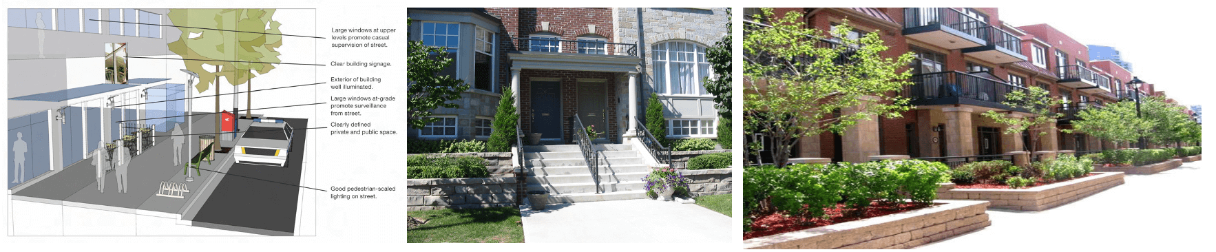 Strategiile fizice CPTED includ: supravegherea naturală, controlul natural al accesului, întărirea teritorială, imaginea și managementul/întreținerea, suportul pentru activități și întărirea site-ului/țintei. Acestea vizează reducerea oportunităților pentru activități infracționale printr-o proiectare inteligentă a spațiilor și prin măsuri de întreținere riguroase. Pe de altă parte, strategiile sociale CPTED se concentrează pe: coeziunea socială, conectivitatea socială, cultura comunitară și capacitatea de prag. Aceste strategii urmăresc să consolideze relațiile și interacțiunile sociale dintr-o comunitate, promovând astfel un mediu sigur și coeziv.