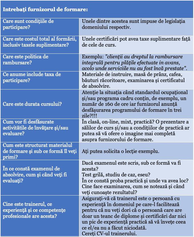 Dacă alegeți un curs pentru a obține diverse certificări internaționale, solicitați furnizorului de formare să vă prezinte dreptul sau de a reprezenta furnizorul internațional de training și acreditările sale pentru viitorul proces de certificare.