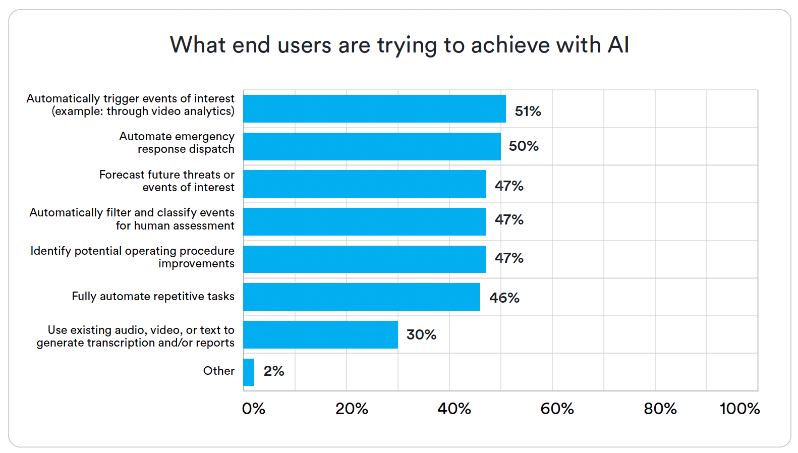 Unul dintre starurile incontestabile ale raportului „State of Physical Security 2025” este Inteligența Artificială (AI). Gândește-te la asta: peste 37% dintre organizații intenționează să integreze AI în operațiunile lor până anul viitor. De ce? Pentru că AI face lucruri care păreau foarte greu de făcut, sau chiar imposibile nu cu mulți ani în urmă: automatizează procese repetitive, filtrează evenimentele importante și chiar prezice posibile amenințări. Practic, devine un partener invizibil, dar extrem de eficient, pentru echipele de securitate.