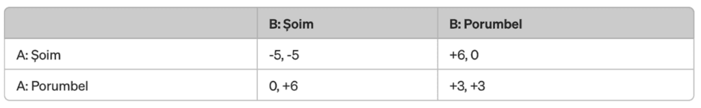Context: Să presupunem că avem doi actori (A și B) care concurează pentru controlul asupra unei resurse valoroase, de exemplu, accesul la un sistem de comunicații vital. Fiecare actor are două opțiuni de acțiune: să acționeze ca un „șoim” (hawk) sau ca un „porumbel” (dove).