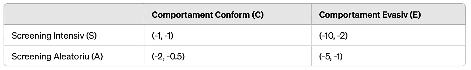 Valoarea din paranteze reprezintă prima cifră pentru utilitatea agenților de securitate și a doua pentru pasageri. Utilitățile negative sunt mai mici, indicând un cost sau disconfort crescut pentru ambele părți. De exemplu, un Screening Intensiv combinat cu un Comportament Conform ar genera disconfort din cauza timpului de așteptare și procedurilor stricte, de aceea ambele părți primesc -1. În schimb, un Comportament Evasiv în contextul unui Screening Intensiv este extrem de riscant și dezavantajos pentru ambele părți, de aceea agenții primesc -10 și pasagerul -2.